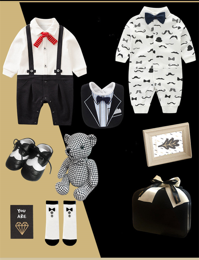 A stylish and elegant baby gentleman gift set designed for little boys who deserve to look their best on every occasion. Each outfit features a refined tuxedo-inspired design with a bow tie, suspenders, and matching accessories — perfect for celebrations, family photos, or special events.