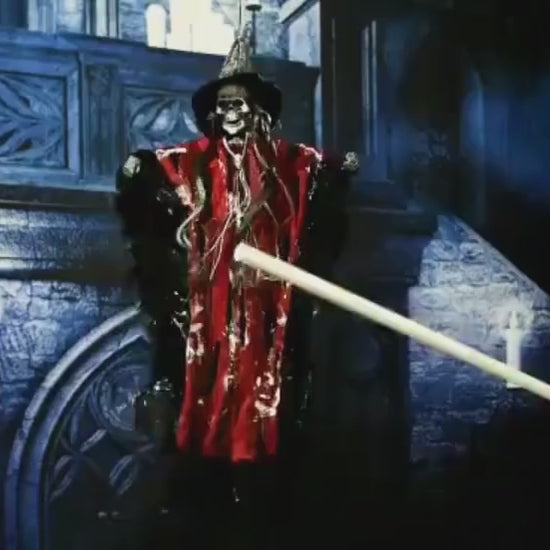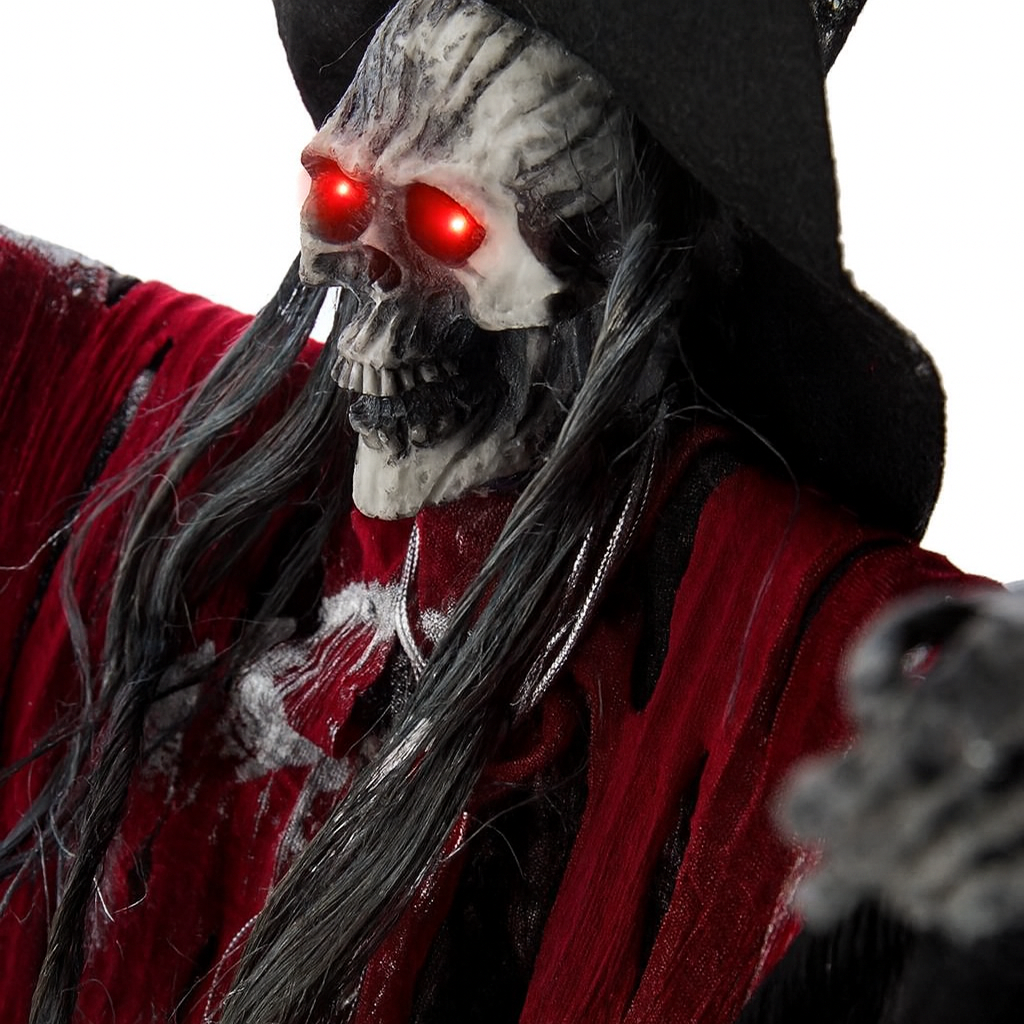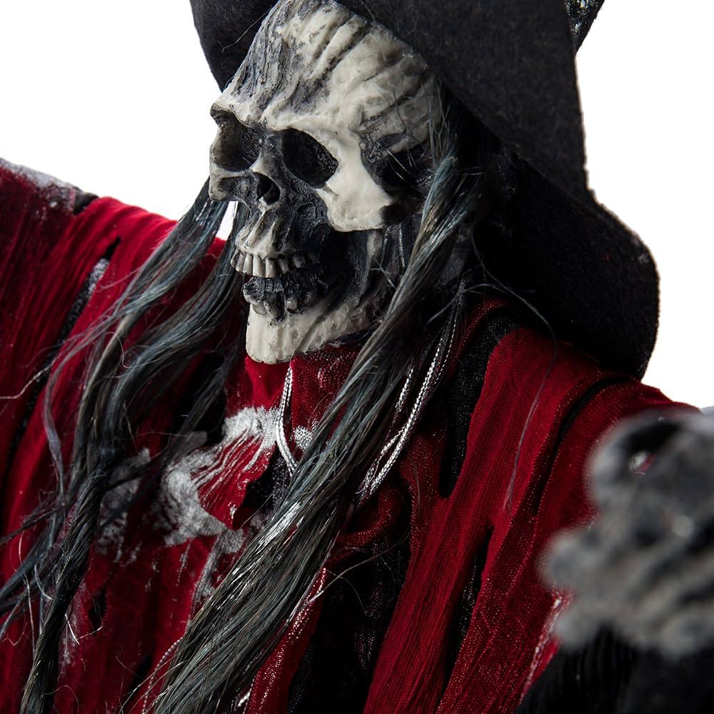 Create a spine-chilling atmosphere this Halloween with this hanging witch skeleton. Dressed in tattered black and red robes, with long grey hair and a sinister face, it features glowing red LED eyes that add an extra scare factor in the dark. Perfect for haunted houses, porches, or indoor party decorations.
