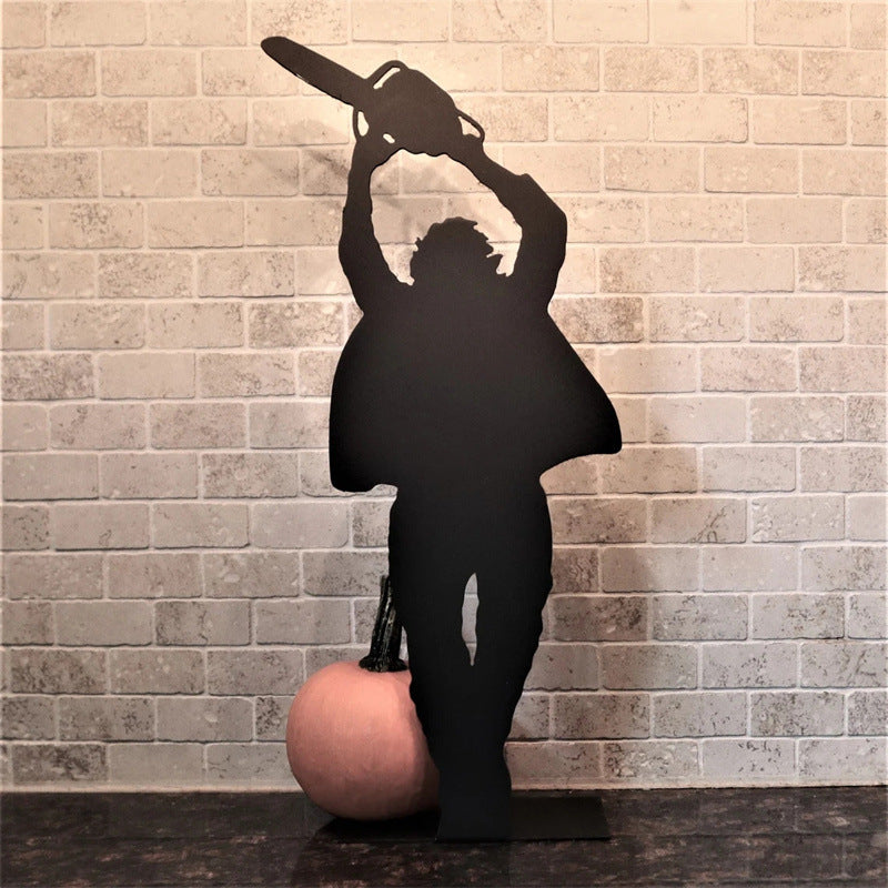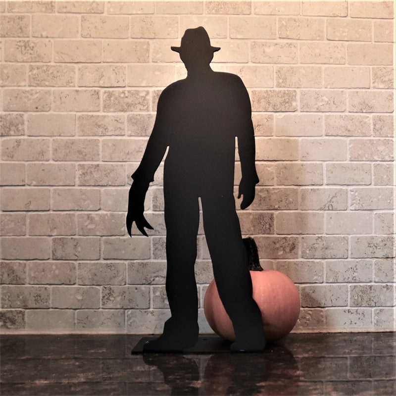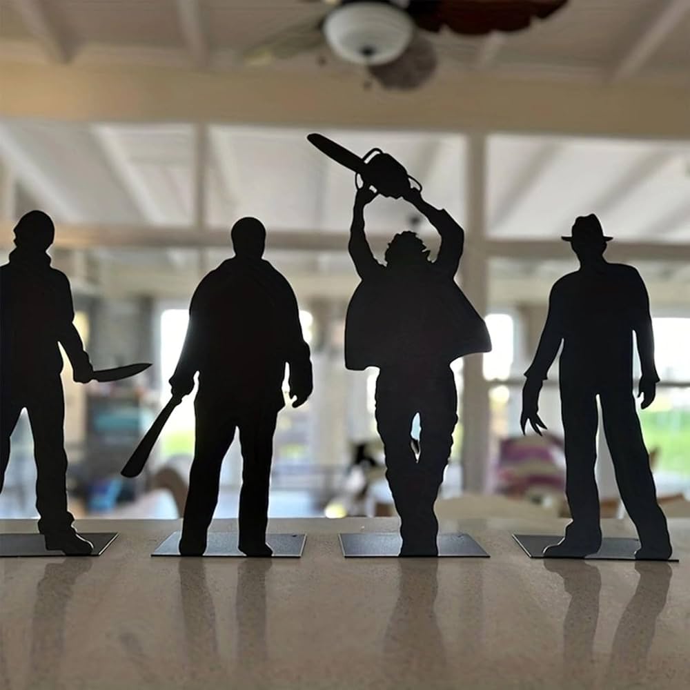 Add a chilling touch to your Halloween décor with this set of horror movie-inspired metal silhouettes. Featuring four infamous slasher figures, these decorations create the perfect eerie vibe when displayed on tables, shelves, or windowsills — especially when backlit by candlelight or LED lights.