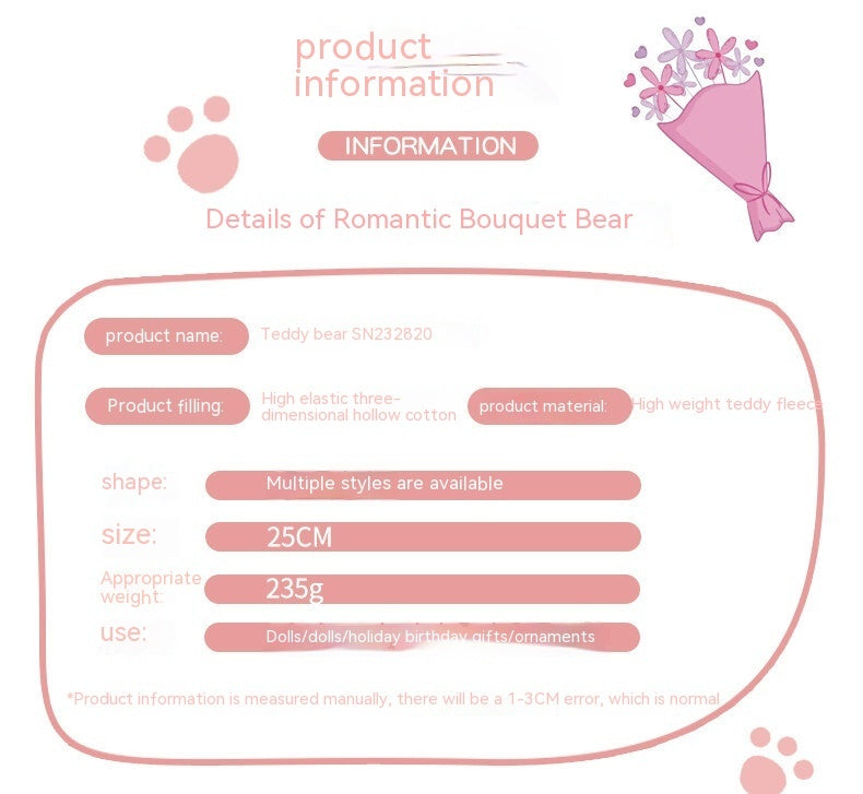 Cute teddy bears holding mini flower bouquets — the perfect blend of charm and warmth. Each bear is crafted from soft, High-Quality plush material with a delicate texture, designed to bring comfort and a smile to anyone who receives it. The adorable bowtie and mini bouquet add an elegant touch, making it an ideal decorative or gift piece for all occasions.